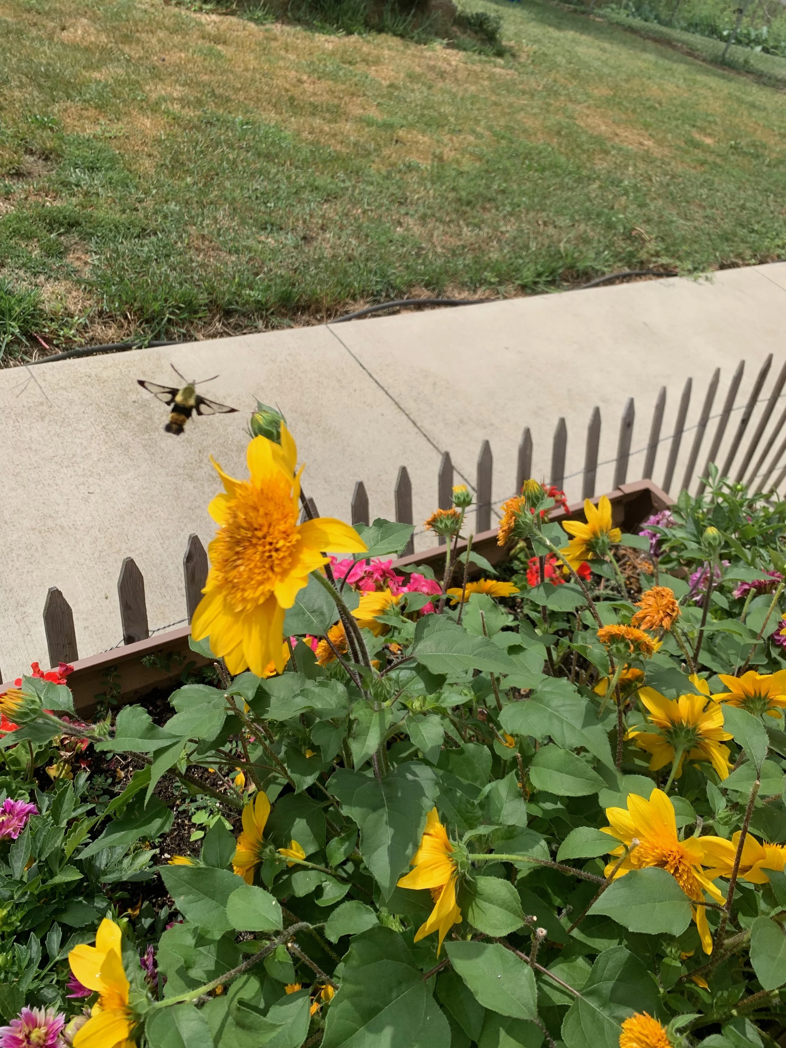 A humingbird moth enjoying sunflowers growing on the farm. A very rare but happy sighting!